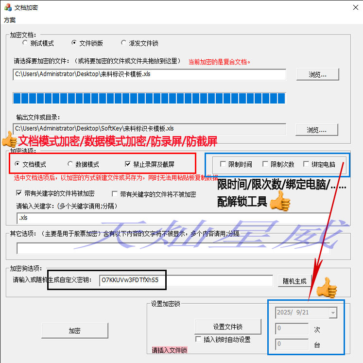 2025年新改进版 天威-文件加密锁 已可直接对非软件类型以外的文件加密、文档加密、数据加密、视频加密,新增防录屏/防截屏;限制时间、限制次数、绑定电脑 和 测试模式使用功能。更好保护客户的《文件资料》不受侵犯;同类加密锁产品中无可代替。