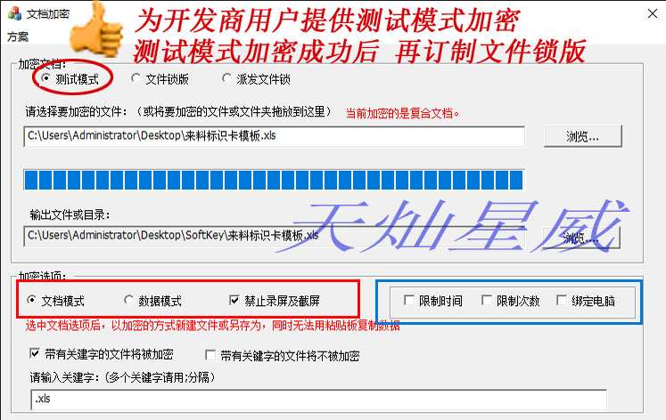 为用户提供测试模式加密功能、测试模式加密成功后、再订制文件锁版、非常方便